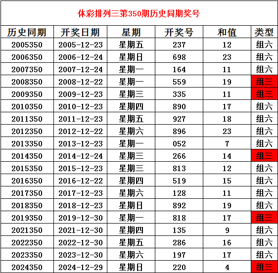 2025年12月30日排列三第350期开奖,历史同期分别开出奖号:
