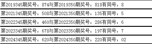 与前期历史同期奖号对比分析,在最近五年开奖中,第345期同期奖号与第350期同期奖号都出现了相同号码: