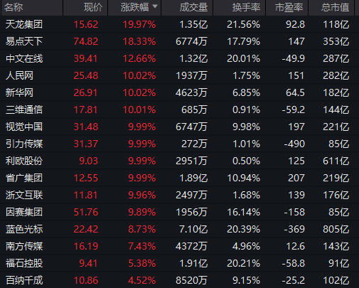 此外,文化传媒、AIGC等方向走高,天龙集团实现20%涨停,人民网、新华网、视觉中国、引力传媒等多股涨停。