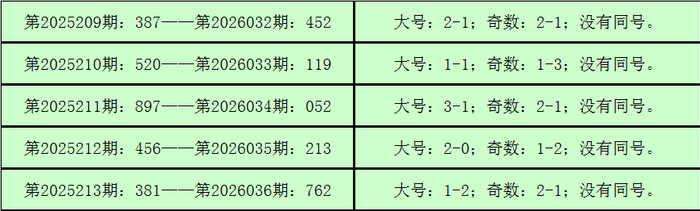 所以,3D第2026035期开出奖号:213,其大小比为0:3,奇偶比为2:1,012路比为1:1:1,与3D第2026037期奖号可能有同号。