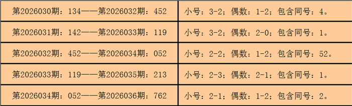 统计3D历史上已开出的奖号发现,在连续5期开奖号码中:3D在第2026030期-第2026034期分别开出奖号:134-142-452-119-052。
