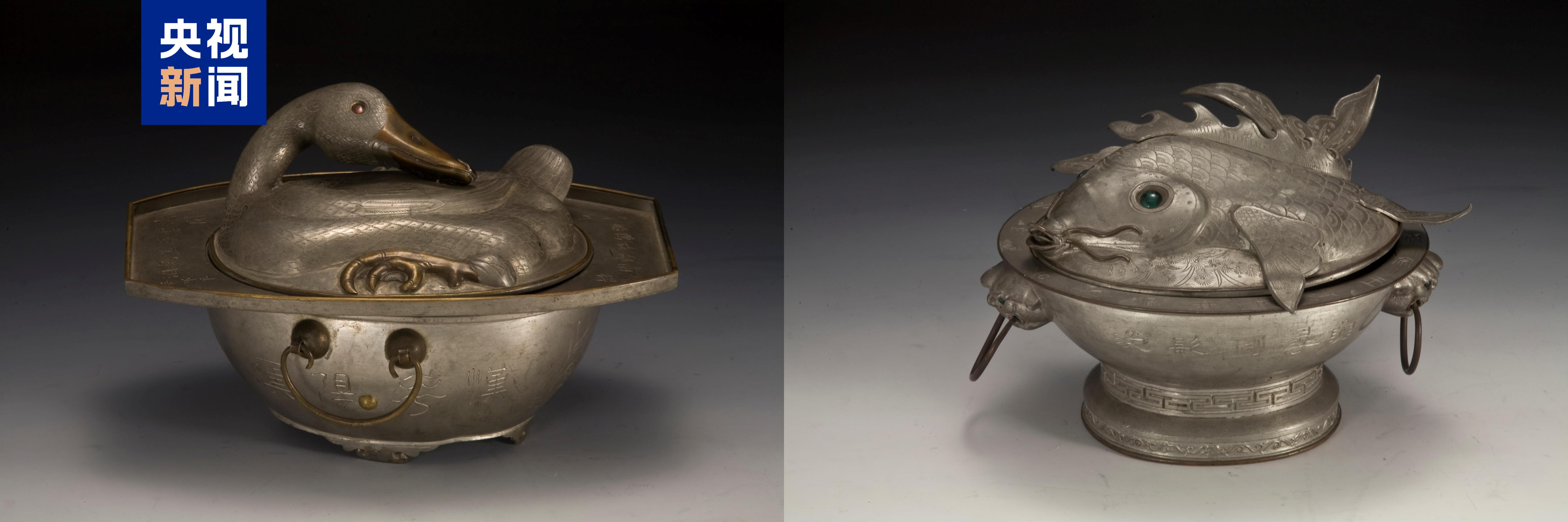 △ 清·錾刻诗文点铜鸭形锡烫锅(左)与清·錾刻诗文嵌玻璃鱼形锡烫锅,点击了解更多