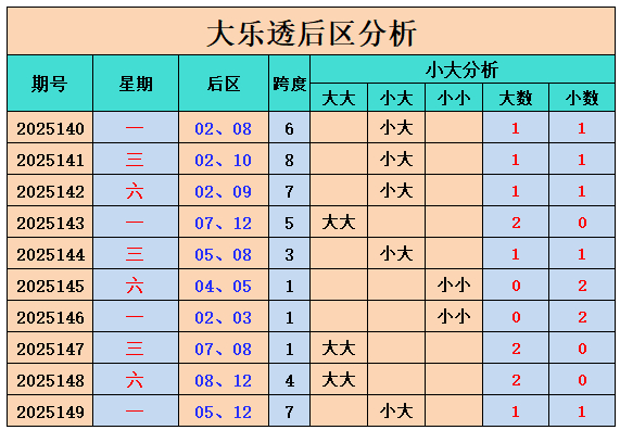 最近10期后区大小比为11:9,最近10期后区大大组合开出3期,小大组合开出5期,小小组合开出2期。上期开出小大组合,本期看好小大组合出现。